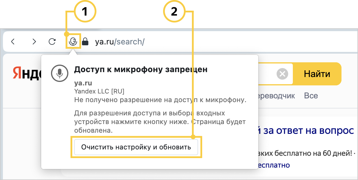 Обновите страницу поисковой выдачи, а затем нажмите значок в поисковой строке. В открывшемся диалоговом окне разрешите использование микрофона (кнопка Разрешаю).