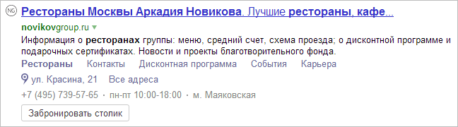 Например, сниппет официального сайта ресторана может выглядеть так: