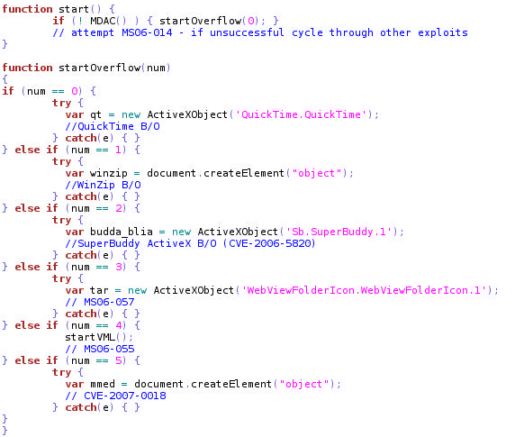 Вредоносное ПО может размещаться на самых разных сайтах. Хакеры могут использовать бесплатные службы веб-хостинга, создавать новые сайты, специально предназначенные для атаки, а также захватывать существующие сайты, превращая их в базу для атаки. В большинстве случаев для заражения жертв используются скрипты (обычно на JavaScript). Так же, как обычные скрипты зачастую опрашивают клиентский браузер, чтобы обеспечить корректное отображение страницы, вредоносные скрипты могут запрашивать браузер, чтобы загрузить подходящий эксплойт. В таких атаках обычно используется перебор списка известных эксплойтов, в ходе которого ищется тот эксплойт, от которого клиент не защищен. Упрощенный псевдокод атаки показан на рисунке ниже. Безусловно, реальные вредоносные скрипты будут использовать множество уловок для маскировки своего содержимого с целью ухода от обнаружения. Хакеры подключают к атаке новые эксплойты по мере обнаружения новых уязвимостей (к примеру, недавно был обнаружен новый ActiveX-эксплойт для элементов управления Yahoo!, работающих с веб-камерами [30]). Учитывая весьма значительные объемы публикуемых сведений о способах успешного использования уязвимостей, задача создания кода эксплойта становится сравнительно простой. Помимо этого, код, применяемый для использования уязвимости в одном элементе управления ActiveX, после минимальной доработки может применяться уже для другого элемента управления.