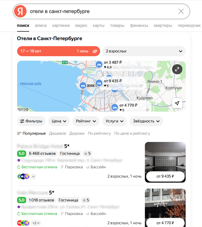 Содержит фото, названия, адреса, рейтинги, цены и условия размещения в объектах, а также отметки на карте. Когда пользователь ищет информацию о вариантах проживания, Поиск может показать ему карусель из карточек объектов, которые лучше всего соответствуют запросу. Кнопки над таким ответом позволяют пользователю уточнить запрос (например, изменить даты и количество проживающих), не покидая страницу поисковой выдачи. Также можно раскрыть карту и выбрать объект по расположению на местности.