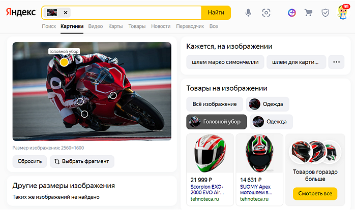Ответ в поисковой выдаче по картинкам может содержать, помимо изображения, данные об одном или нескольких товарах: фото, цену, краткое описание, неперсонализированную информацию о скидках и бонусах за покупку. Информация может быть представлена как подборка релевантных запросу пользователя карточек товара и как информация об указанном пользователем товаре на картинке. Информация формируется автоматически на основе обработки данных поискового робота или переданных фидов. Подробнее см. в Справке Яндекс Товаров.