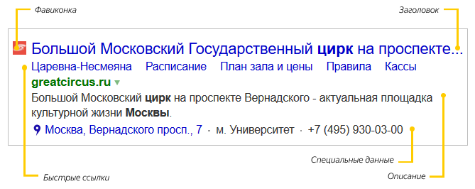 Благодаря сниппету пользователь получает представление о странице или нужную информацию, не заходя на сайт. В сниппете могут отображаться: