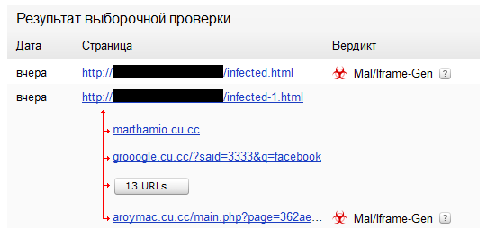 Чтобы помочь вебмастерам быстрее находить и удалять вредоносный код, Яндекс показывает информацию о цепочках хостов, через которые при просмотре страниц заражённого сайта в браузер пользователя загружается вредоносный код.