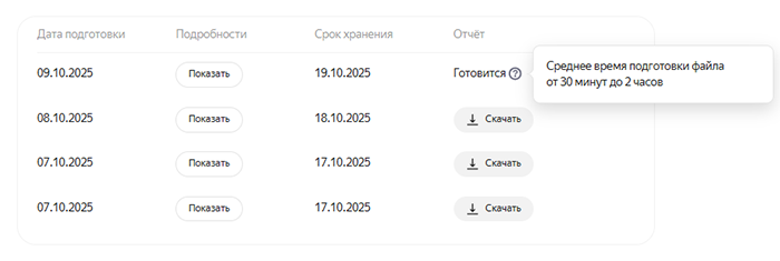 Готовые и формирующиеся отчеты отображаются в таблице в нижней части страницы. Чтобы посмотреть подробности о выгрузке (отчете), в таблице напротив нужного отчета нажмите Показать.