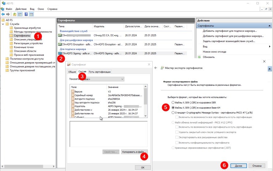 4. Выберите тип сертификата Файлы X.509 (.CER) в кодировке Base-64 и нажмите Далее.