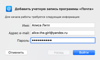 - Адрес e-mail: ваш почтовый адрес на Яндексе (например, «alice.the.girl@yandex.ru»);