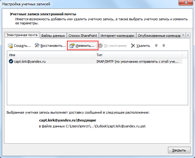 Откройте меню Файл → Настройка учетных записей, выберите учетную запись на вкладке Электронная почта и нажмите Изменить.