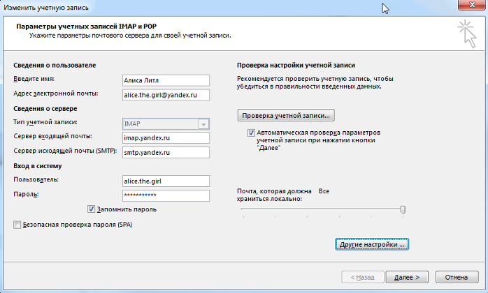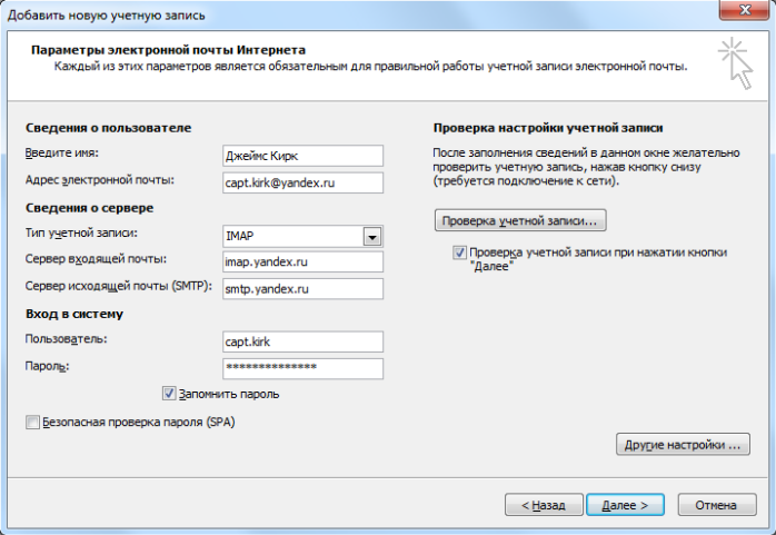 Чтобы завершить настройку учетной записи, в окне Добавить учетную запись нажмите Далее — будет выполнена проверка настроек учетной записи. Если проверка завершилась удачно, нажмите Готово. Если нет, убедитесь, что все параметры указаны корректно.