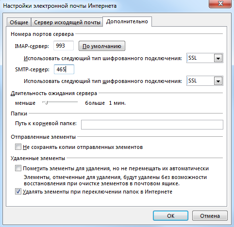 Перейдите на вкладку Дополнительно. Выберите в пункте Использовать следующий тип шифрованного подключения значение SSL для IMAP- и SMTP-сервера. Укажите следующие параметры: