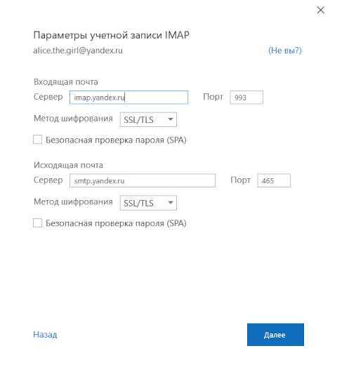 imap.yandex.ru(илиimap.ya.ru, если вы подключаетесь не из России); - Сервер исходящей почты (SMTP) —
