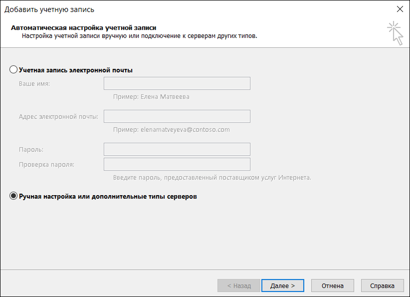 Выберите значение Ручная настройка или дополнительные типы серверов и нажмите Далее.