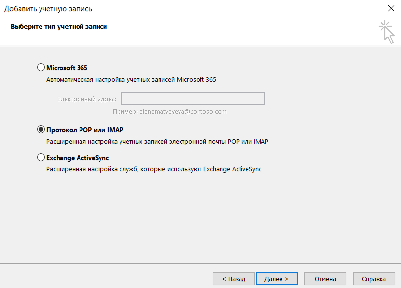 Выберите значение Протокол POP или IMAP и нажмите Далее.