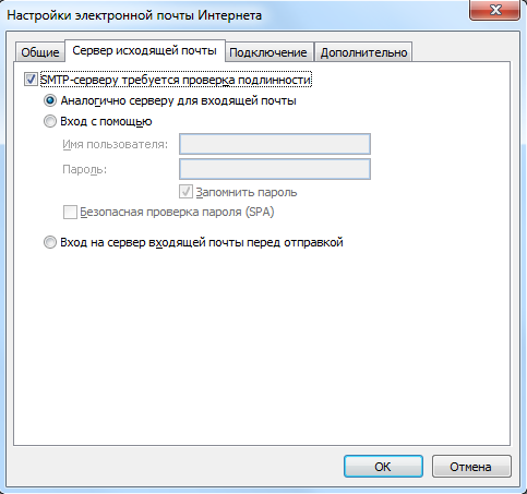 Перейдите на вкладку Сервер исходящей почты, включите опцию SMTP-серверу требуется проверка подлинности и выберите значение Аналогично серверу для входящей почты.