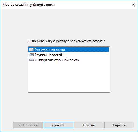 Запустите программу, выберите в списке типов учетных записей пункт Электронная почта и нажмите кнопку Далее.