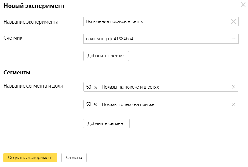В созданном эксперименте невозможно удалить сегмент или добавить новый. Удалить можно только эксперимент, который не используется в кампании в Яндекс Директе.