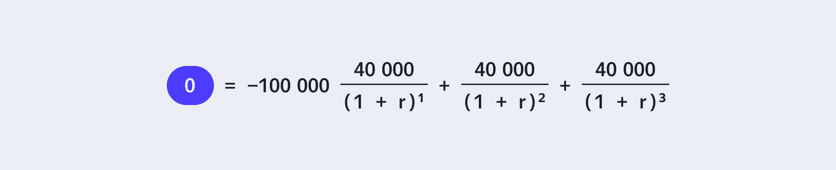 Компания инвестирует 100 000 ₽ в проект и планирует получать по 40 000 ₽ ежегодно в течение трёх лет.