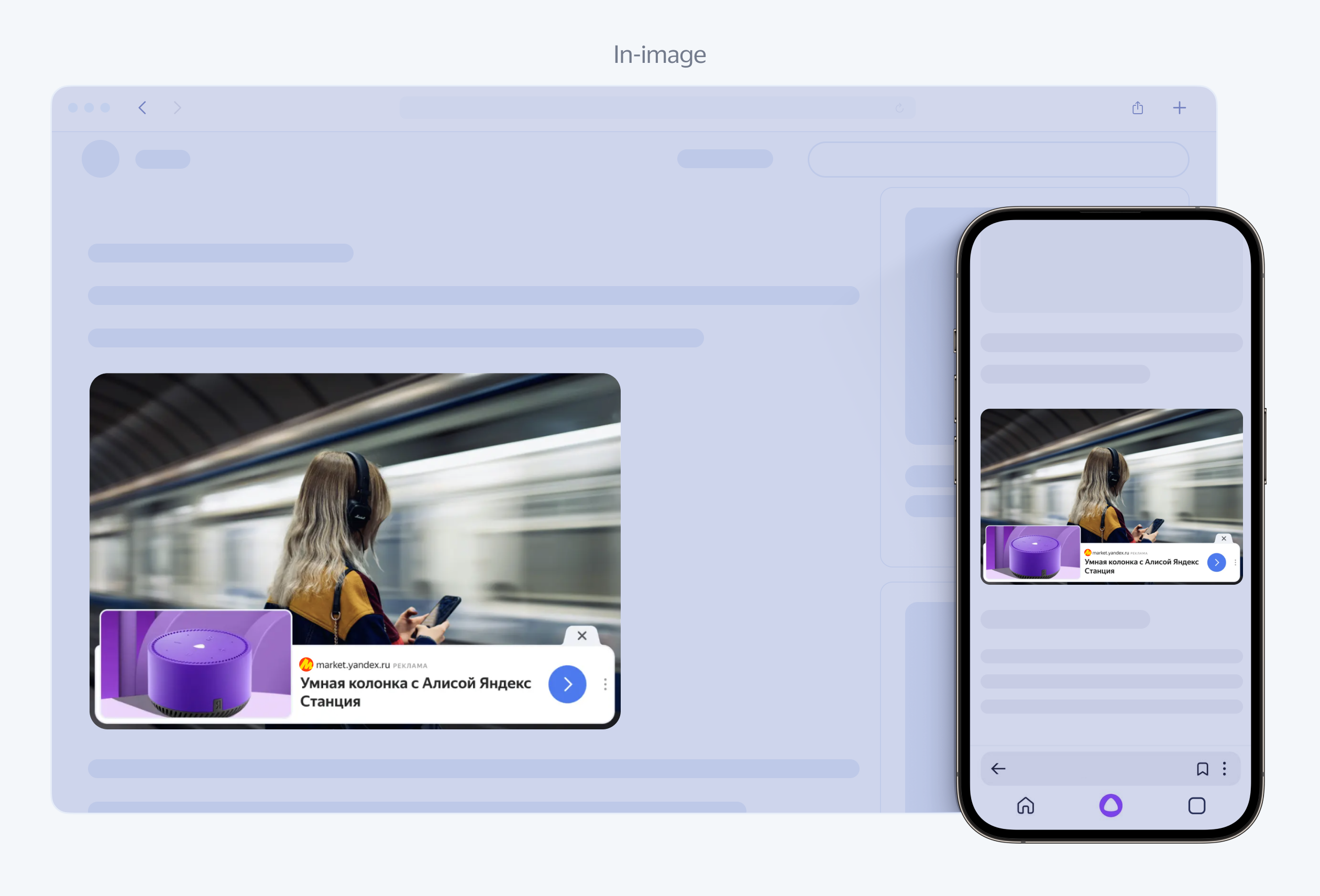 In-Image показывается через две секунды после открытия страницы и привязывается к изображению внутри контента страницы. Закрыть рекламу можно в любой момент.