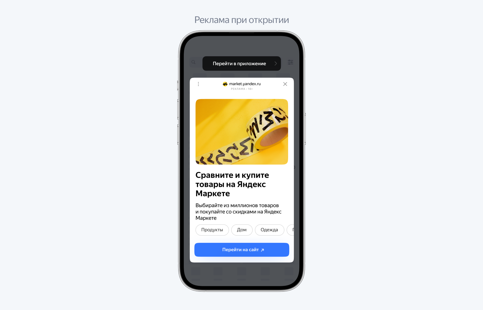 Блоки, которые отображаются при загрузке приложения: при первичном открытии или при возвращении в уже открытое приложение. Реклама занимает экран не полностью — чтобы пользователь видел, в какое приложение зашёл, и мог следить за процессом загрузки. Вернуться в приложение можно с помощью кнопки с таймером.