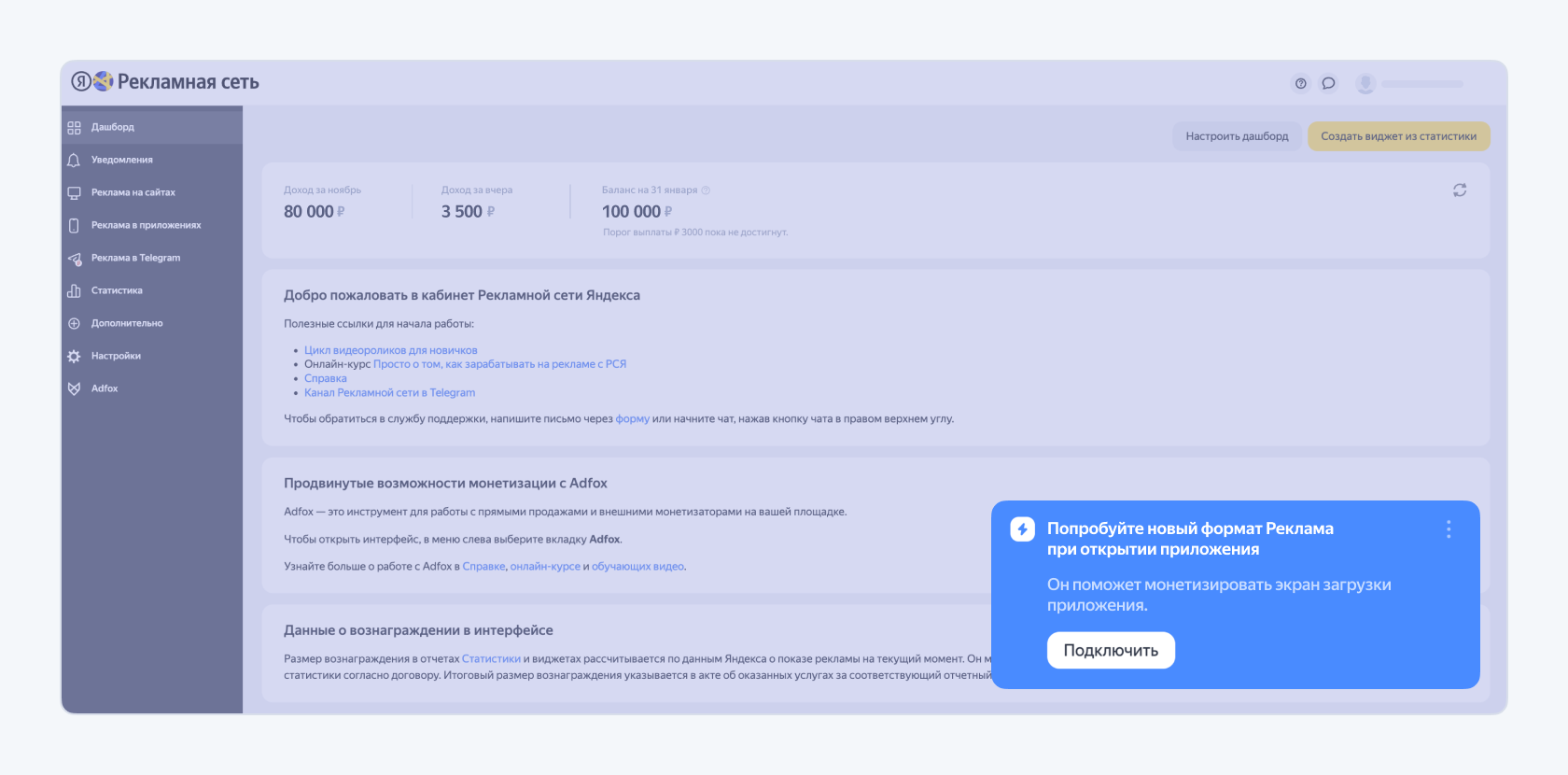 Во вкладке «Статистика» можно отслеживать, какой доход приносит реклама, как изменяется вознаграждение с течением времени, какой эффект дают эксперименты или изменения на площадках.