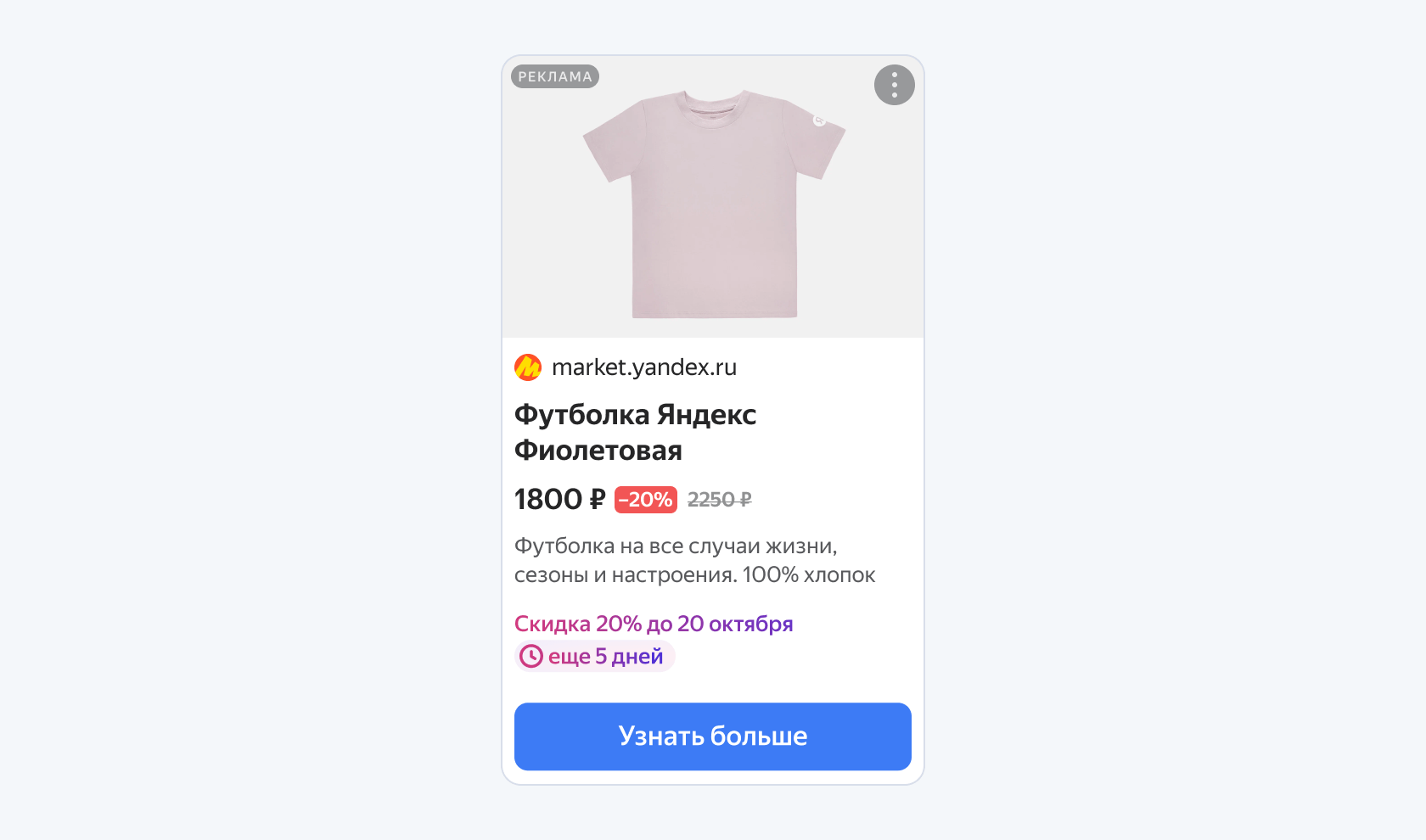 Информация об акциях теперь может показываться в товарных объявлениях — однотоварных баннерах и мозаике. Настроить промоакции можно в Единой перфоманс-кампании на уровне группы объявлений или кампании.