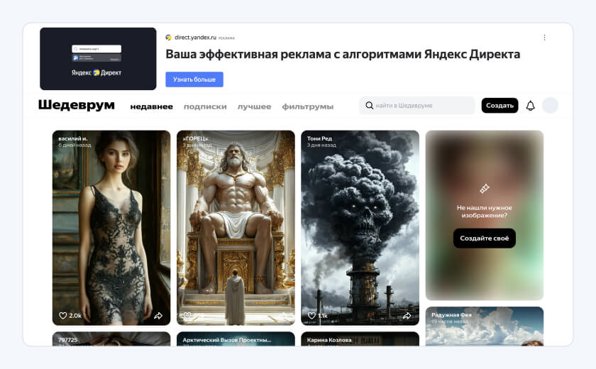 Шедеврум — это приложение, которое генерирует картинки, видео и клипы с помощью нейросети YandexART, а также тексты с помощью YandexGPT. Теперь во всех версиях сервиса поддерживаются рекламные блоки РСЯ. Они уже показывают высокие показатели вовлечённости, приносят длинные клики и конверсии.