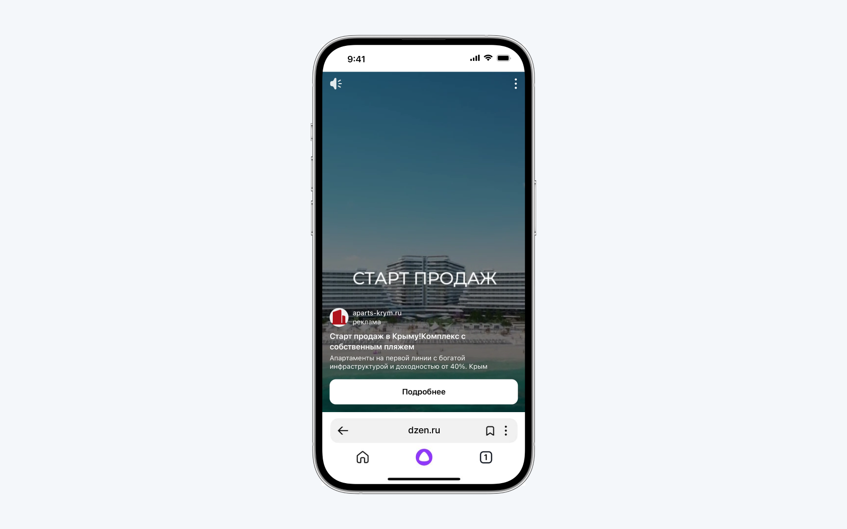 Теперь в мобильной версии сайта dzen.ru доступен новый формат, в котором могут показываться только вертикальные видео. Новый формат органично вписывается в раздел с вертикальными видео «Ролики». Реклама в вертикальном формате интегрируется максимально нативно и позволяет значительно увеличить вовлечённость пользователей по сравнению с обычными горизонтальными рекламными видео в статьях или в ленте. Средний CTR такого формата — 1,2%.