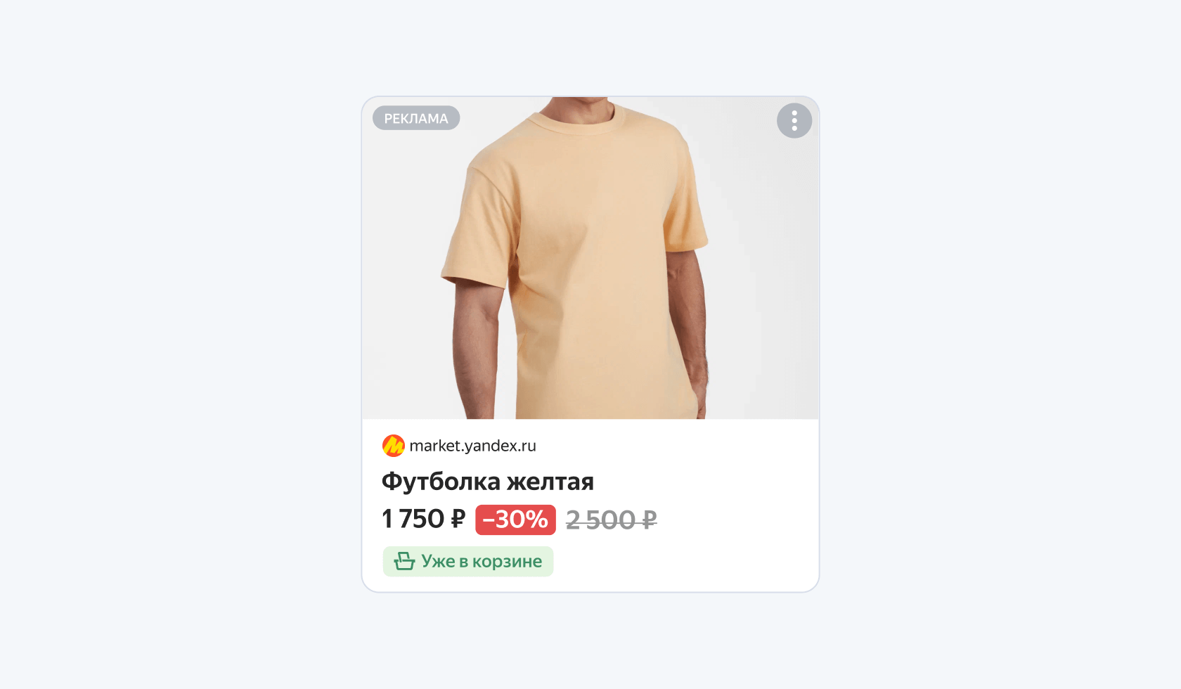 - Метка «Уже в корзине» добавляется на объявления товаров, которые пользователь оставил в корзине. Эта метка привлекает внимание, напоминает о забытых товарах и в итоге повышает конверсионность объявлений. Обязательное условие для её показа — установленная Метрика и корректно настроенная электронная коммерция в ней.