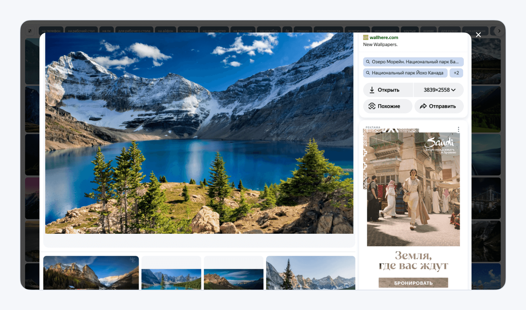 В новом просмотрщике Картинок ещё больше места для медийной рекламы и текстово-графических объявлений. Заметное расположение справа от картинки обеспечивает высокую видимость и привлекает внимание пользователей.