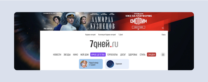 Медиа 7дней.ru забрендировало фон сайта с помощью шаблона Banner Background HTML5, чтобы привлечь внимание к проекту рекламодателя. Брендирование меняется, когда пользователь переходит между разделами сайта.