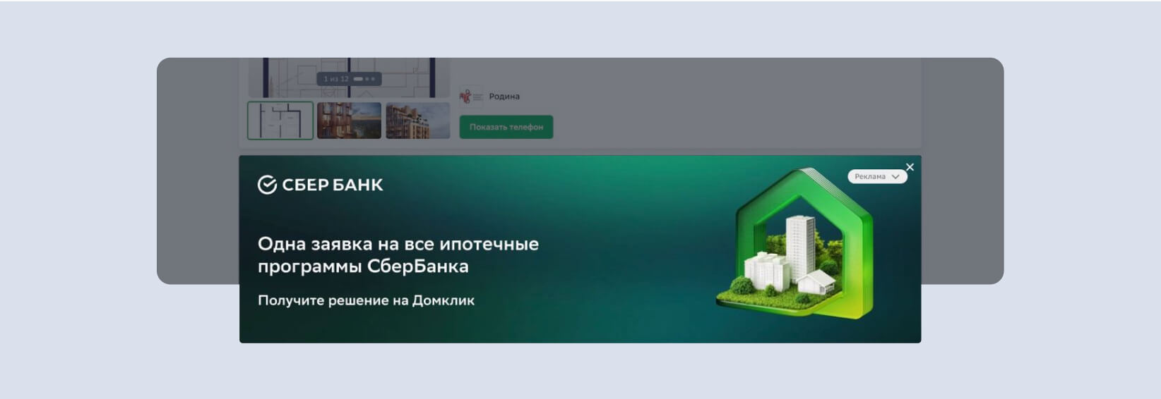 Сайт сервиса по подбору недвижимости Домклик разместил баннер-перетяжку в ленте объявлений. Формат создан с помощью шаблона «Проброс кода». Это наиболее гибкий шаблон, с помощью которого вы можете создавать собственные уникальные варианты рекламных блоков.
