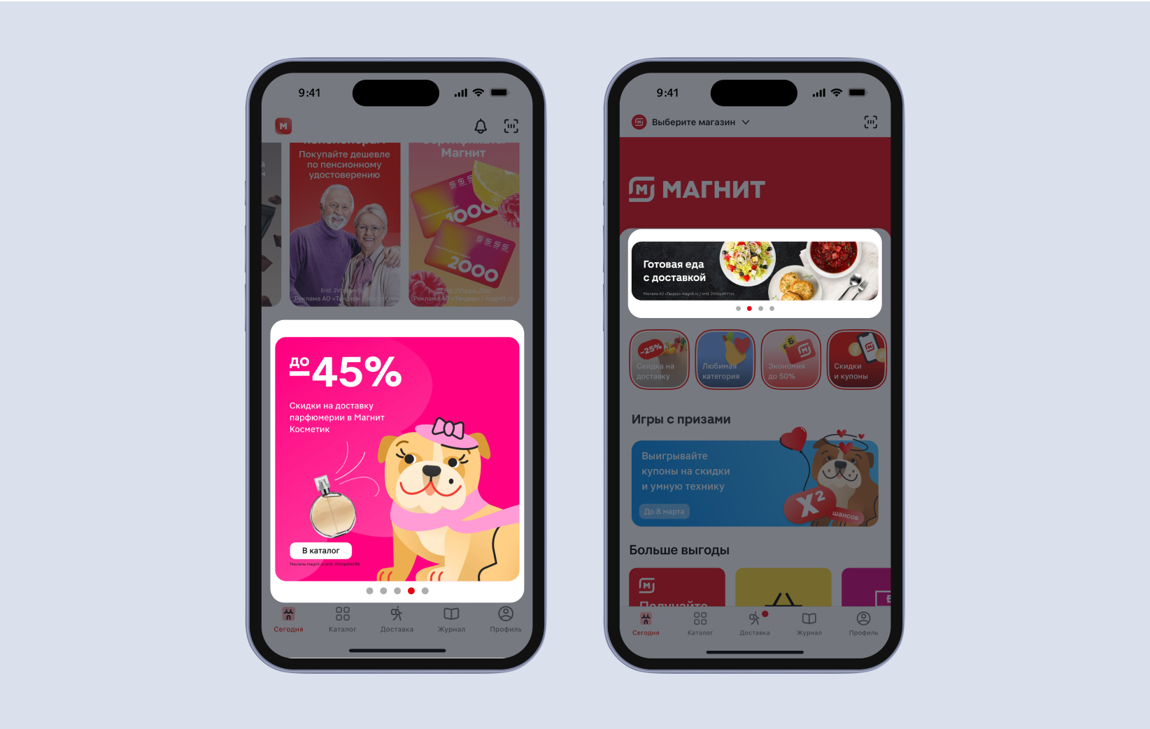 «Магнит» расставляет нужные акценты в своём приложении с помощью слайдеров Adfox. Так ритейлер привлекает внимание, например, к спецпредложениям или новым разделам. В этом помогают шаблон App Native Slider и отдельные нативные баннеры (шаблон Media Native).