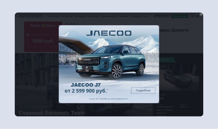 Издание РБК на площадке autonews.ru использует шаблон Fullscreen HTML5 для прямых продаж рекламы. Тесты показали, что такое смелое решение привлекает внимание, но не сказывается на поведенческих метриках.