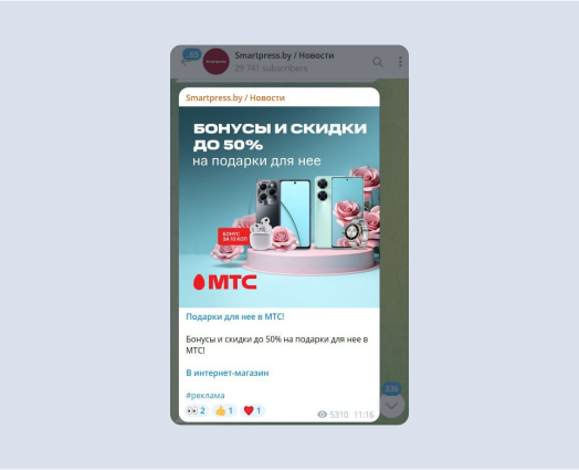 С февраля публиковать прямую рекламу через Adfox можно и в телеграм-каналах. Такие посты привлекают внимание и при этом выглядят максимально органично. Подробности читайте в Справке.