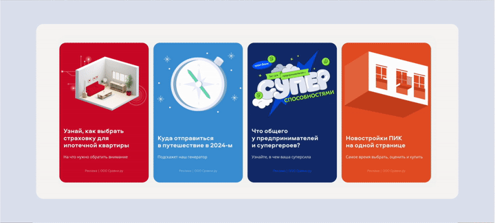 Финансовый маркетплейс Сравни выбрал для раздела со спецпроектами на главной странице шаблон Banner HTML5. Так компания рассказывает сразу о нескольких проектах партнёров на одном экране.