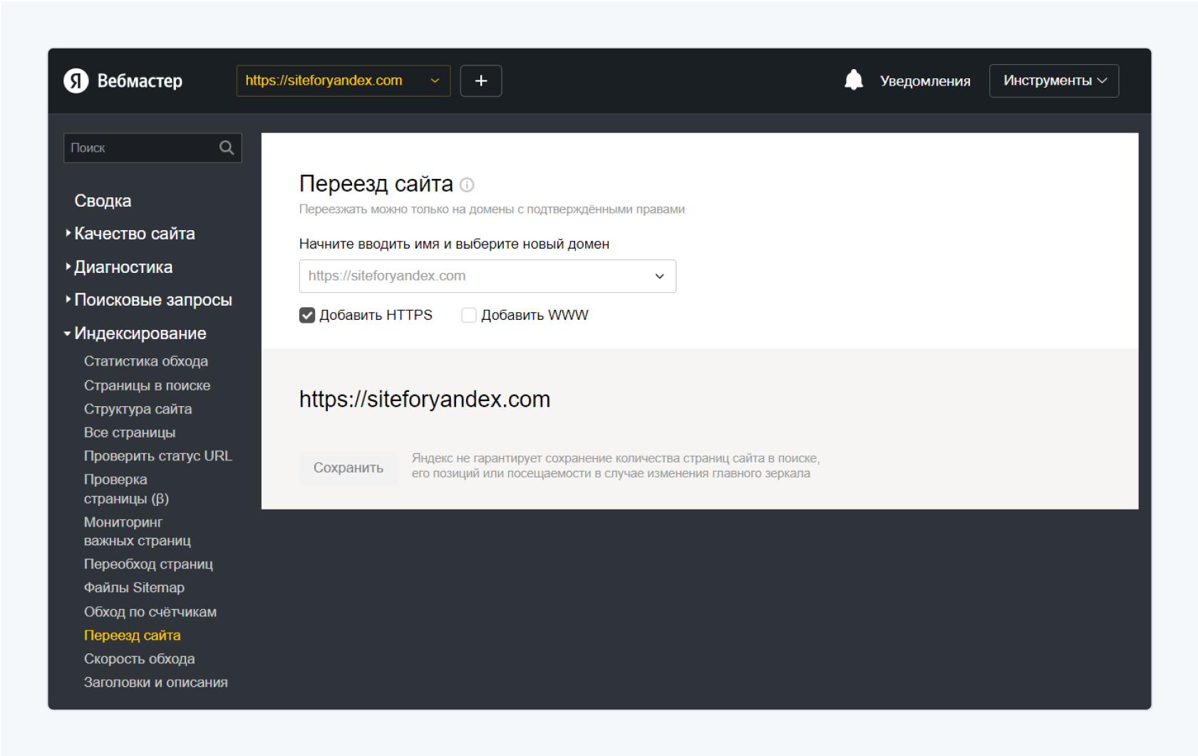 Сообщить роботу о внесённых изменениях можно в Яндекс Вебмастере. Для этого нужно зайти в раздел «Настройка индексирования», далее «Переезд сайта» и выбрать нужный домен из списка. Если этот домен там отсутствует, значит, он ещё не был добавлен на странице «Мои сайты».