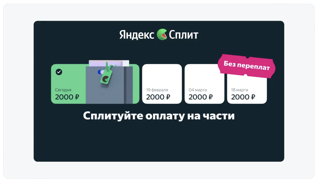 Сначала Сплит был интегрирован на Маркете, а потом стал доступен и для всех партнёров Яндекс Пэй. Теперь бизнес может подключить оплату в Сплит у себя на сайте, а его клиенты — платить частями.