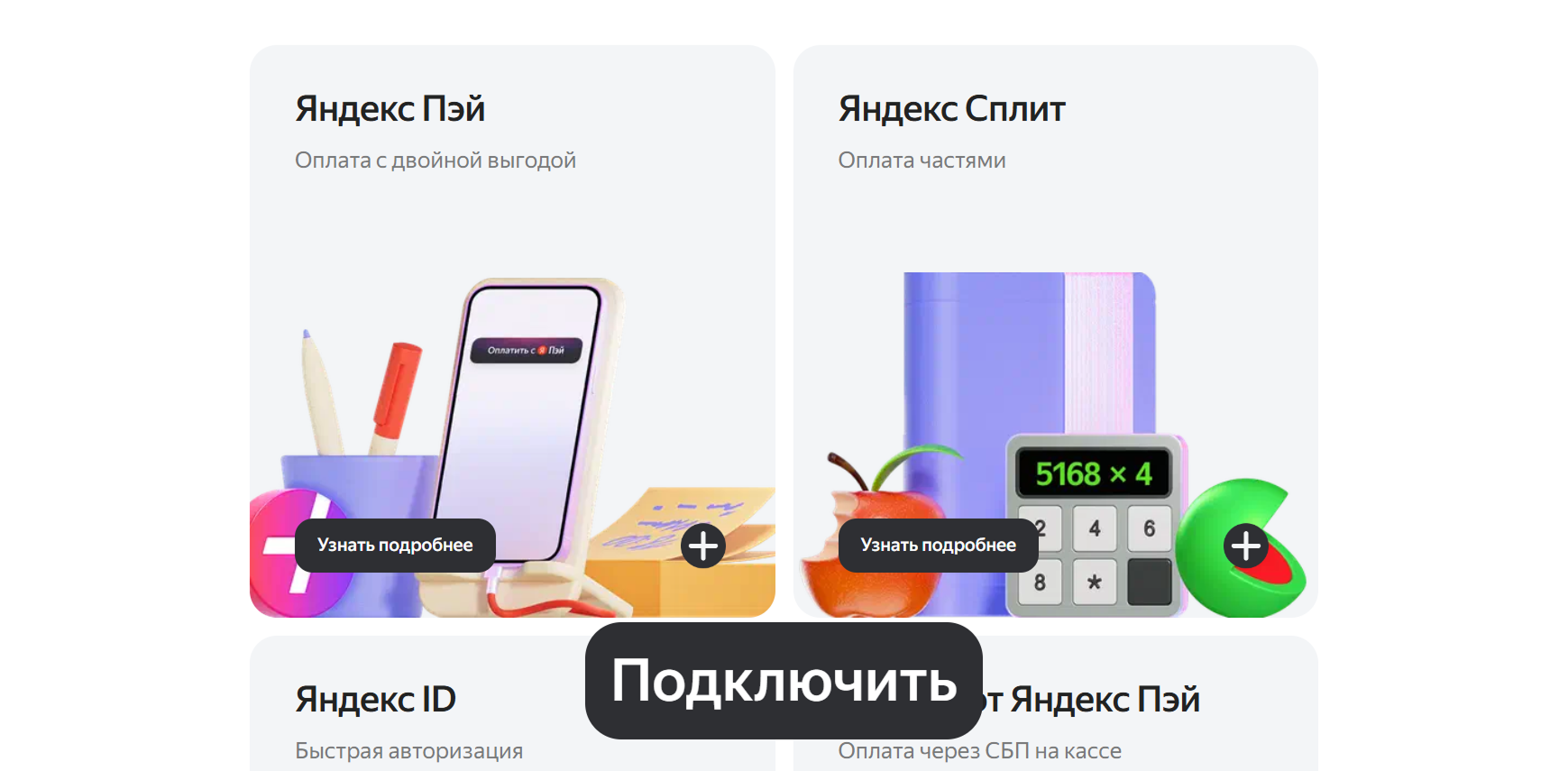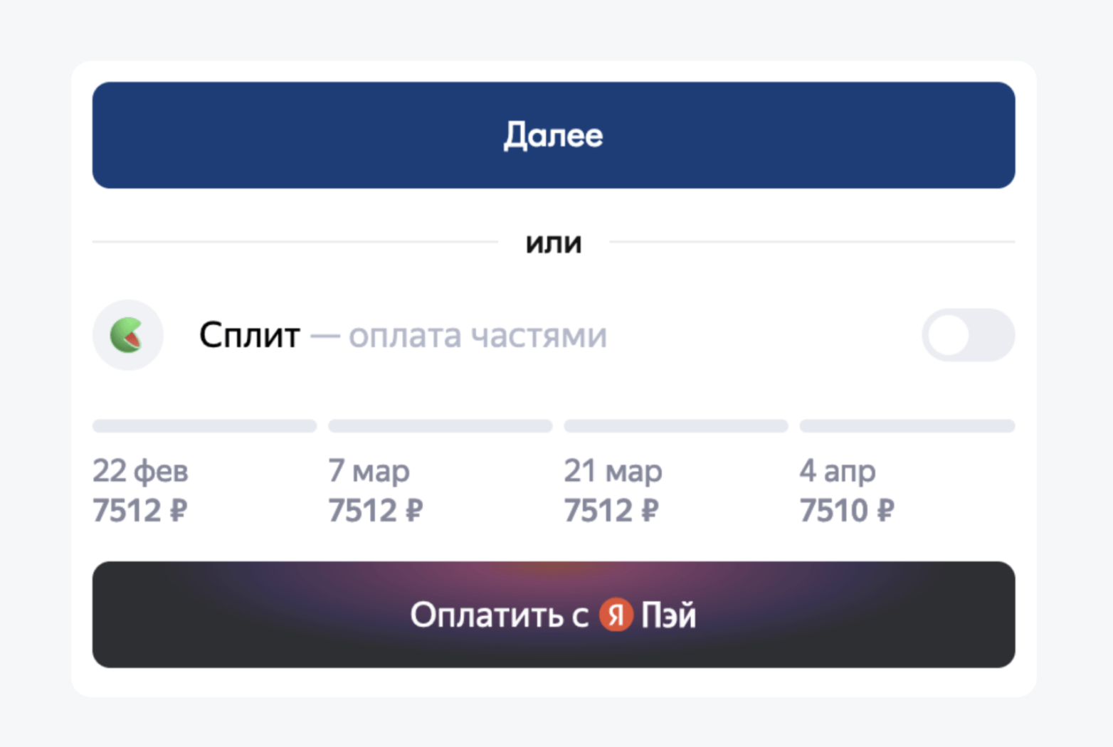 Сплит подключается вместе с Яндекс Пэй — сервисом удобной оплаты с дополнительным кешбэком. При полной оплате с Яндекс Пэй покупатель получает кешбэк баллами Плюса. Чтобы пользоваться сервисом, не обязательно иметь платёжную карту Яндекс Пэй, подойдёт любая банковская карта, привязанная к аккаунту Яндекса. Клиент выбирает способ оплаты Яндекс Пэй, вводит данные аккаунта, а Яндекс автоматически подгружает данные его карты. В итоге человек оплачивает покупку быстрее, и вдобавок ему начисляются баллы Плюса.