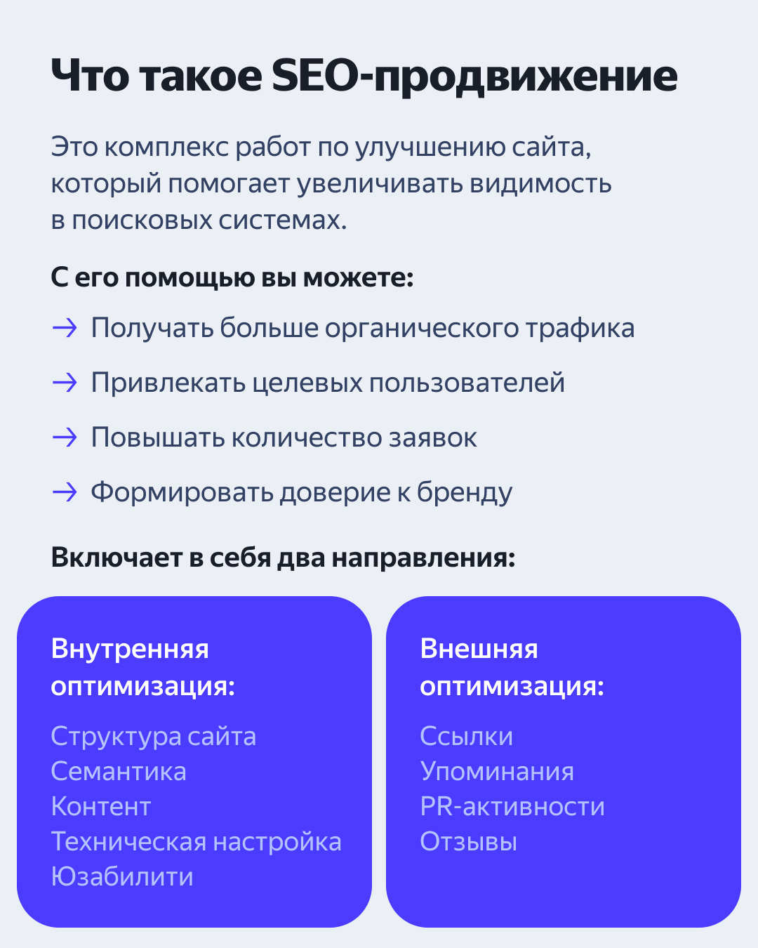 Чтобы продвинуть ресурс в результатах Поиска, нужно последовательно выполнить несколько видов работ.