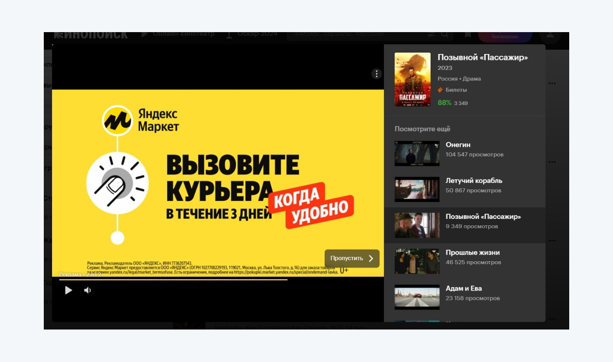 Прероллы появляются на контенте Кинопоиска в разделе «Видео» в Поиске — ниже пример такой рекламы.
