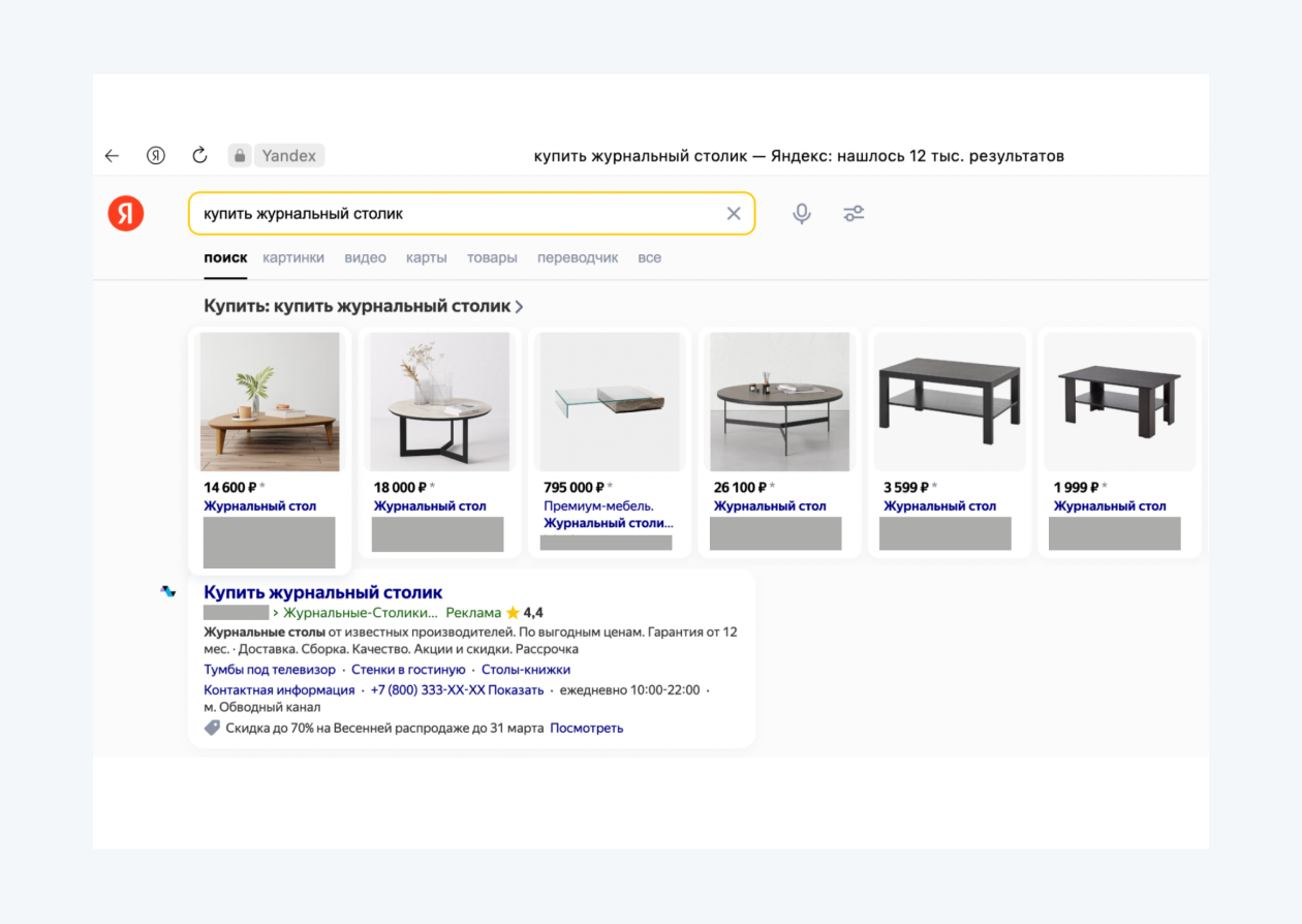 Если решили продвигать интернет-магазин, попробуйте инструмент «Товарная кампания» в Яндекс Директе. Он позволяет рекламировать товары с сайта в товарной галерее Поиска и самом Поиске, Рекламной сети Яндекса (РСЯ) и его сервисах: Погоде, Музыке, Кинопоиске и других.