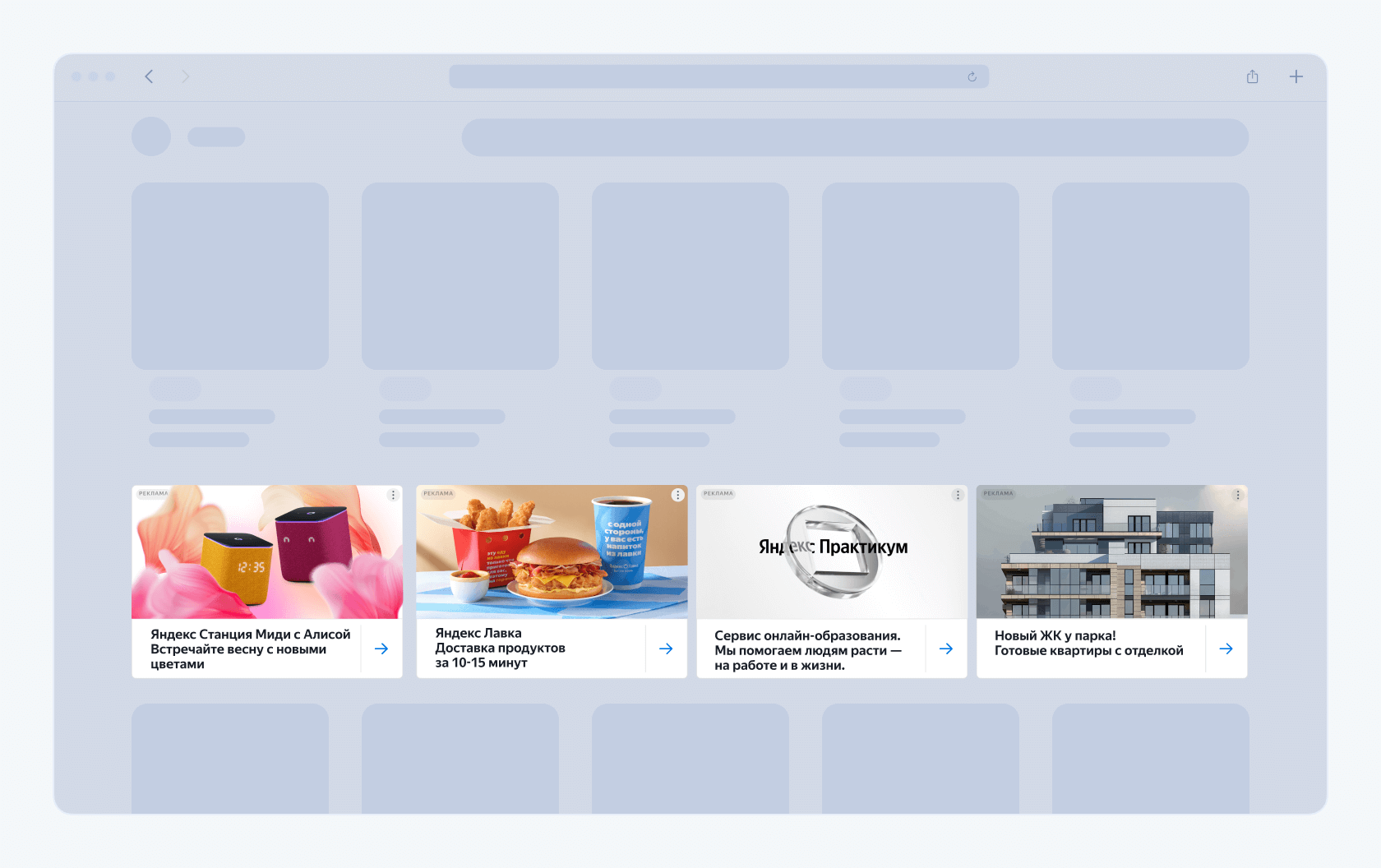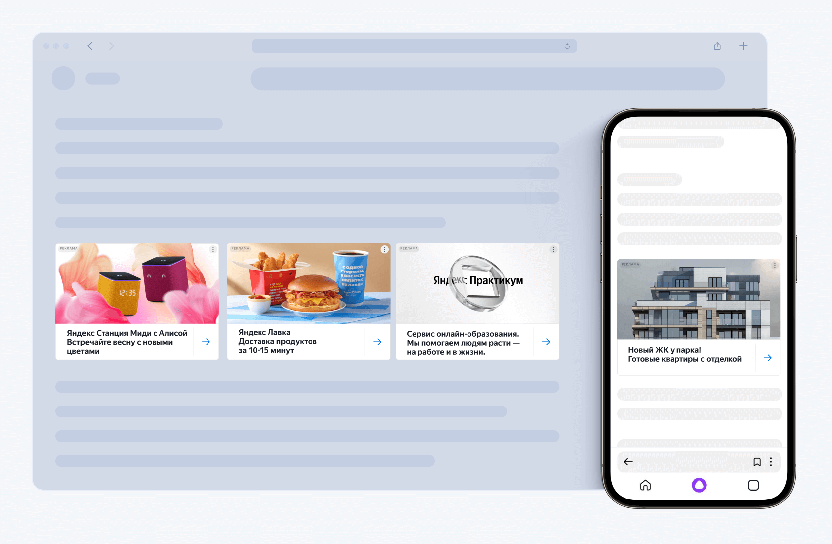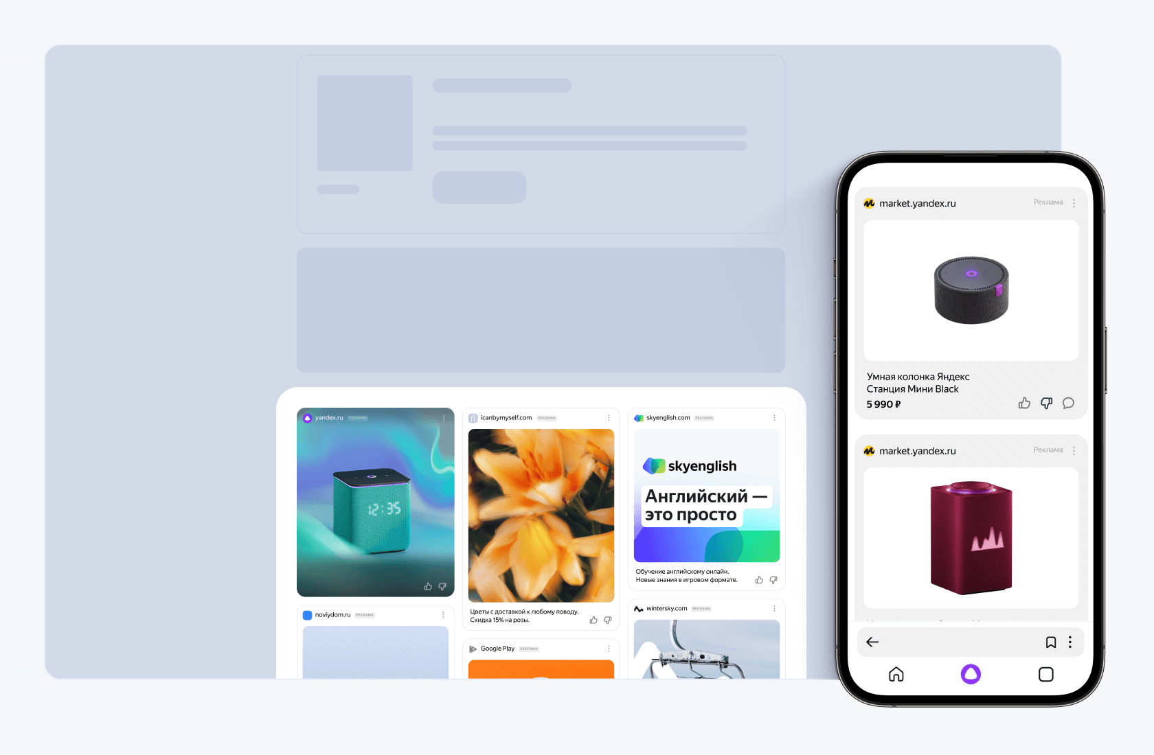 Или используйте Ленту. Этот формат предлагает пользователю потенциально интересные объявления, что значительно увеличивает вероятность взаимодействия с ней. Лента помогает органично встроить рекламу в общий дизайн страницы, делает объявления менее навязчивыми, но эффективными.