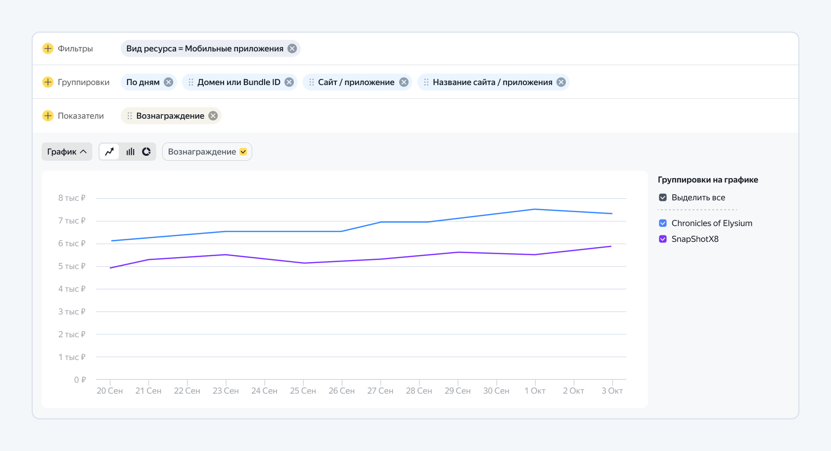 Помогает отслеживать доход разных типов ресурсов, например сайта и приложения. В отчёте доступна статистика в РСЯ в разрезе дней, домена или Bundle ID и названия площадки. Такой отчёт поможет узнать, сколько заработала каждая площадка в определённый день, а график позволит сравнить результаты.