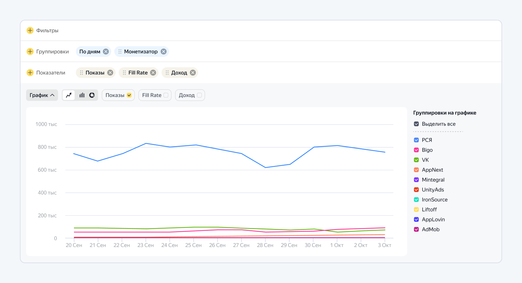 Отчёт позволяет оценить эффективность каждой добавленной рекламной сети. В том числе определить, где более высокие ставки, а где достаточный спрос рекламодателей на вашу площадку.