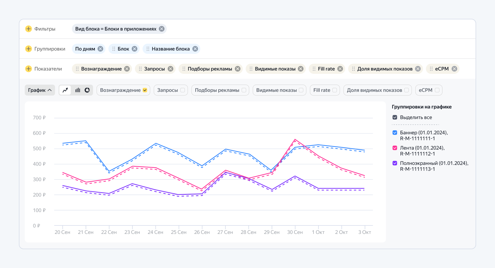 Позволяет оценивать результаты монетизации и эффективность каждого блока в разрезе по дням. Данные по запросам, подборам, Fill Rate и доле показов покажут, насколько эффективно монетизируется блок. Например, если запросов много, подборов рекламы мало, а Fill Rate низкий, это может быть связано с условиями, настроенными для блока и площадки. Другой пример: если у блока низкая доля видимых показов, возможно, пользователи редко заходят в этот раздел приложения или код вызова рекламы не успевает показать объявления до того, как пользователь уйдёт в другой раздел приложения.