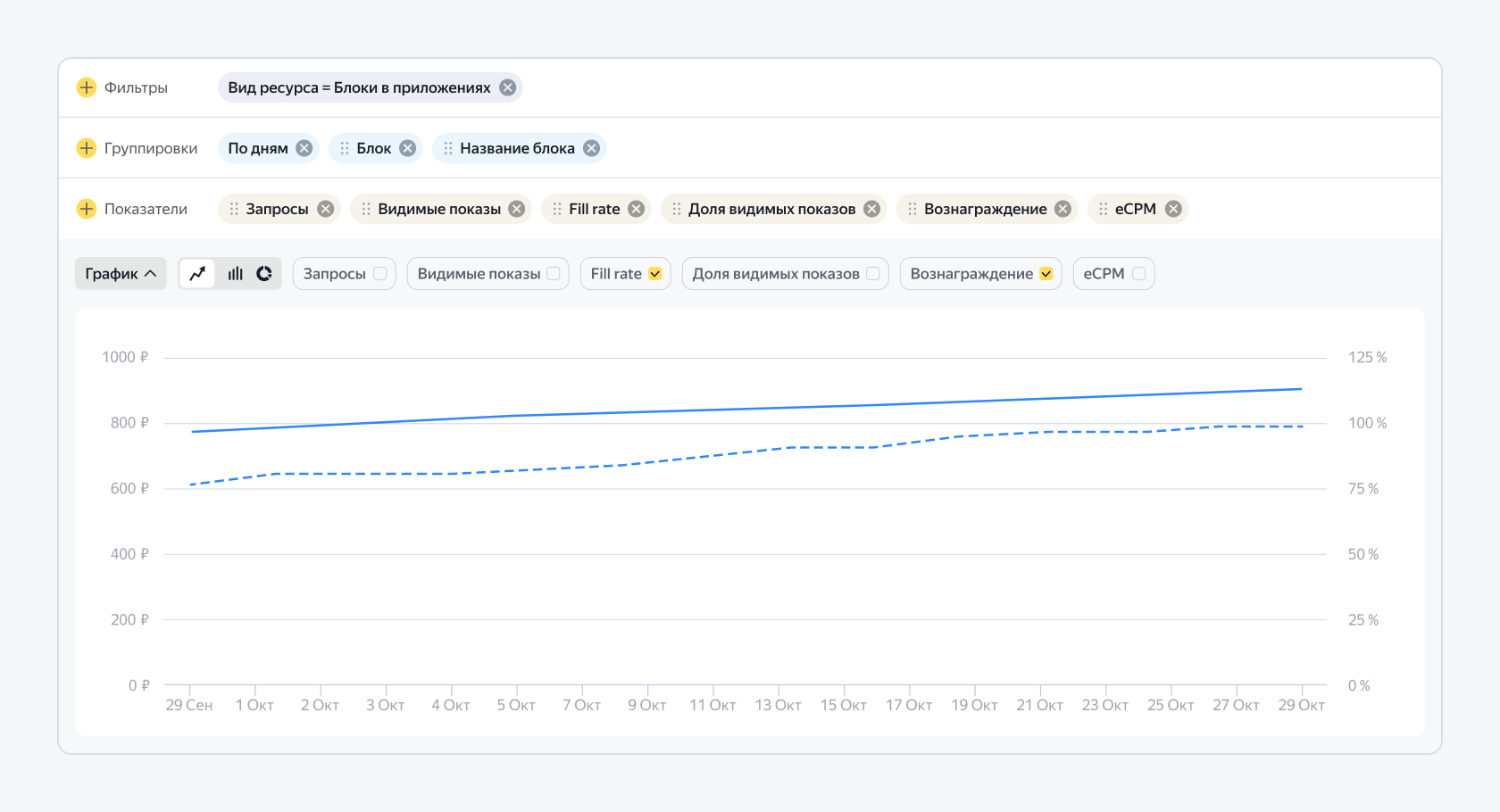 Показатели: «Вознаграждение», «Запросы», «Видимые показы», eCPM, Fill Rate, «Доля видимых показов»