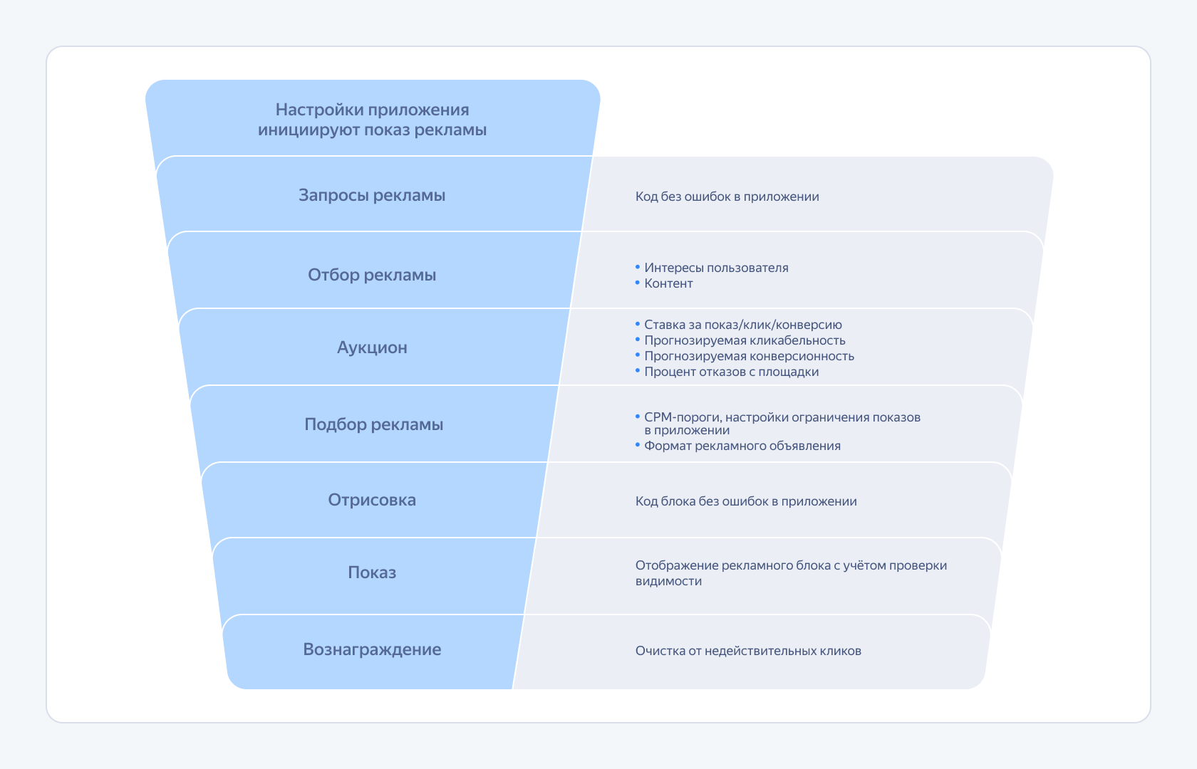 После этого алгоритмы Рекламной сети отбирают рекламные объявления, которые соответствуют интересам пользователя и контенту приложения. В этот момент бороться за показ могут десятки тысяч объявлений.