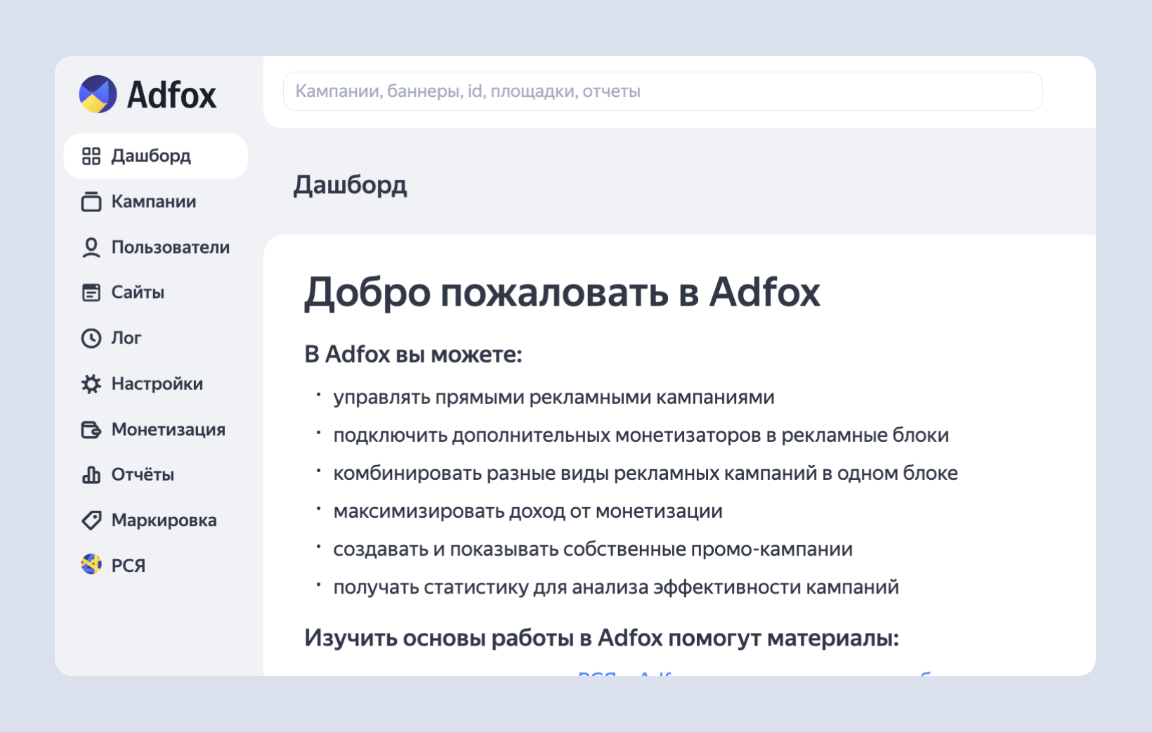 Все вкладки основного меню Adfox теперь находятся в левой части экрана. А в правой части экрана можно найти данные Яндекс ID, чат с поддержкой и ссылку на Справку.