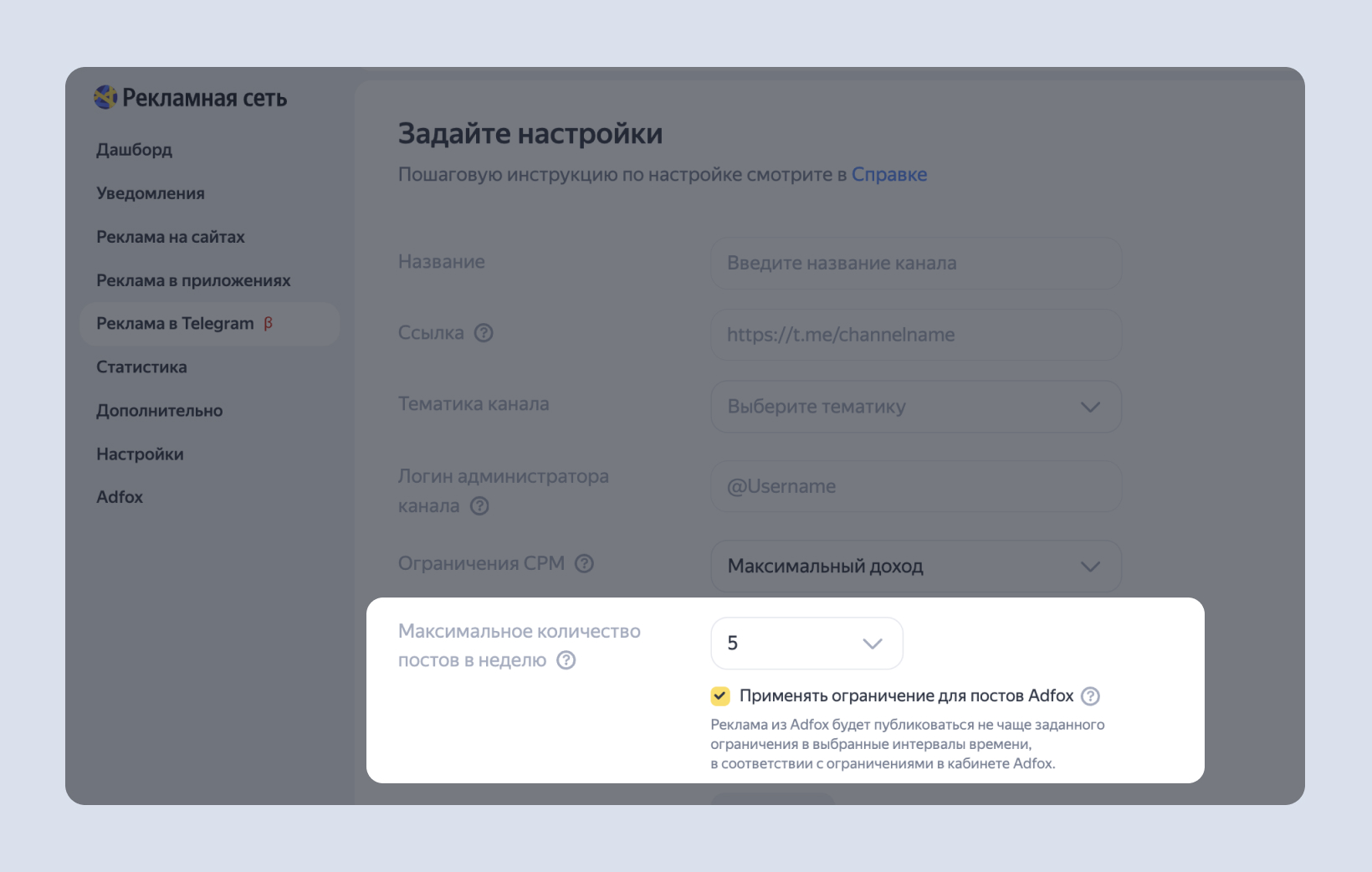 Теперь, чтобы ограничить общую частоту показа рекламных постов в канале для Adfox и Рекламной сети Яндекса, в настройках канала в поле «Максимальное количество постов в неделю» нужно включить опцию «Применять ограничение для постов Adfox». Посты смогут выходить в любом из временных слотов, выбранных в настройках канала, с учётом заданной частоты. Всего от Adfox и РСЯ может выйти столько постов, сколько указано в настройках. Подробнее — в Справке.